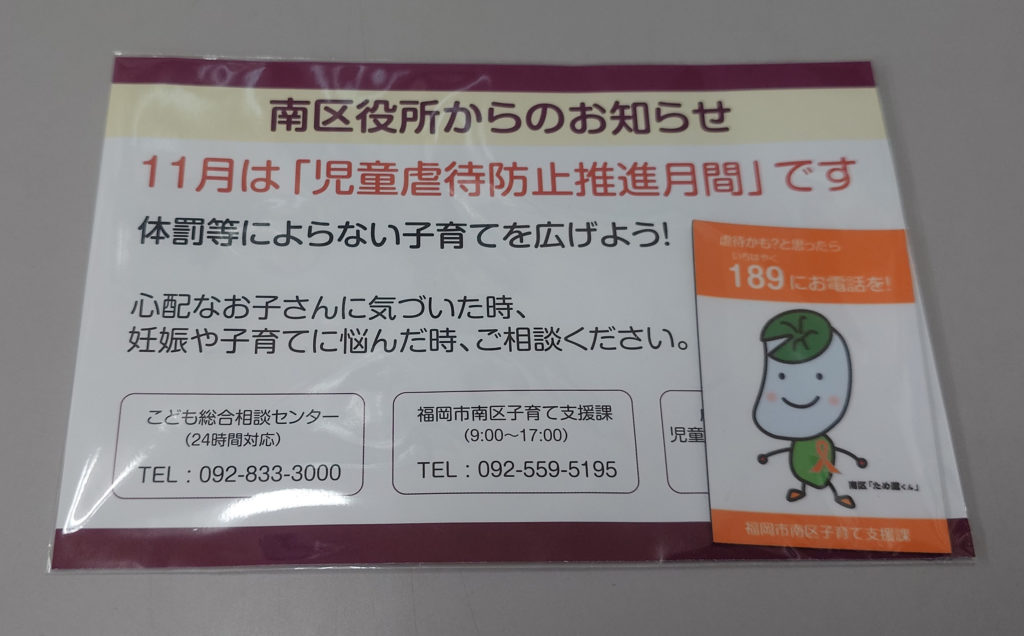 毎年11月に「オレンジリボン・児童虐待防止推進キャンペーン」を実施し、児童虐待問題に対する深い関心と児童虐待防止のための広報・啓発活動に集中的に取り組みます。街中などで配布されていたりします。虐待対応ダイヤル「189」まで